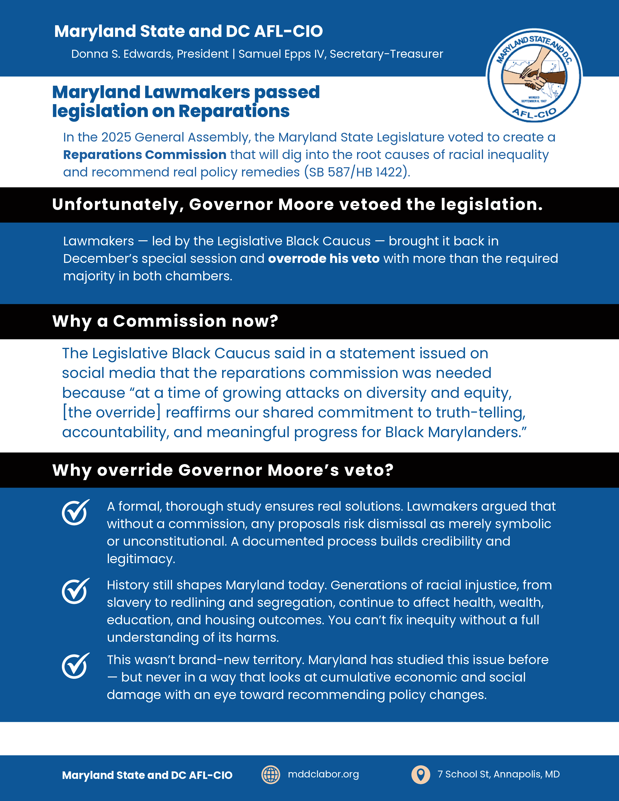 In the 2025 General Assembly, the Maryland State Legislature voted to create a Reparations Commission that will dig into the root causes of racial inequality and recommend real policy remedies (SB 587/HB 1422).